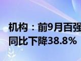 中指院研究今日发布的报告显示,2024年1-9月,TOP100房企销售总额为29699 4亿元,同比下降38 8%,降幅较上月扩大0 3个百分点。其中,9月单 浏览全文>>