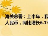 据海关统计,上半年,我国货物贸易进出口总值21 17万亿元人民币,同比(下同)增长6 1%。其中,出口12 13万亿元,增长6 9%;进口9 04万亿元 浏览全文>>
