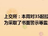 上交所公告,本周对35起拉抬打压、虚假申报等证券异常交易行为采取了书面警示等监管措施,对17起上市公司重大事项等进行专项核查。文章转载 浏览全文>>