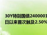 30Y特别国债2400001收益率上行2BP至2 50%。为6月18日以来首次触及2 50%。 此前24特别国债01(续3), 中标利率2 4989%, 边际3 4812倍, 全 浏览全文>>