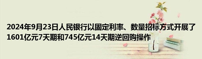 2024年9月23日人民银行以固定利率、数量招标方式开展了1601亿元7天期和745亿元14天期逆回购操作