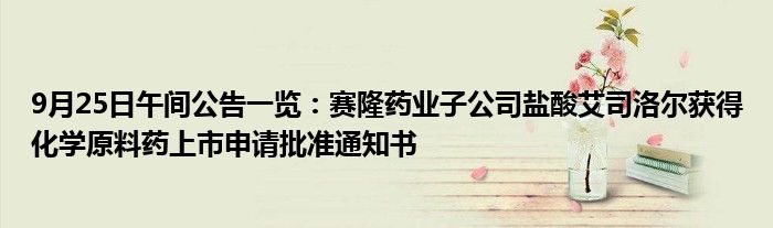 9月25日午间公告一览:赛隆药业子公司盐酸艾司洛尔获得化学原料药上市申请批准通知书