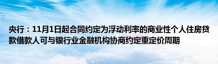 央行:11月1日起合同约定为浮动利率的商业性个人住房贷款借款人可与银行业金融机构协商约定重定价周期