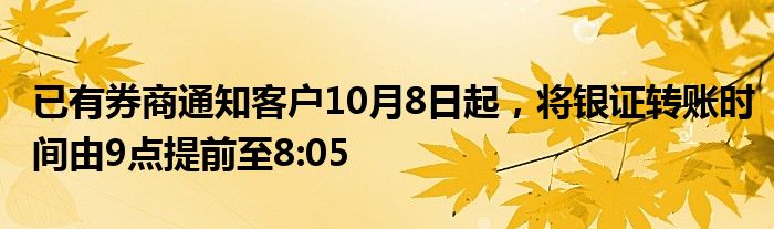 已有券商通知客户10月8日起,将银证转账时间由9点提前至8:05