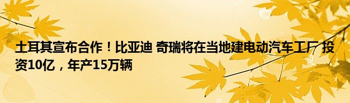 土耳其宣布合作!比亚迪 奇瑞将在当地建电动汽车工厂 投资10亿,年产15万辆